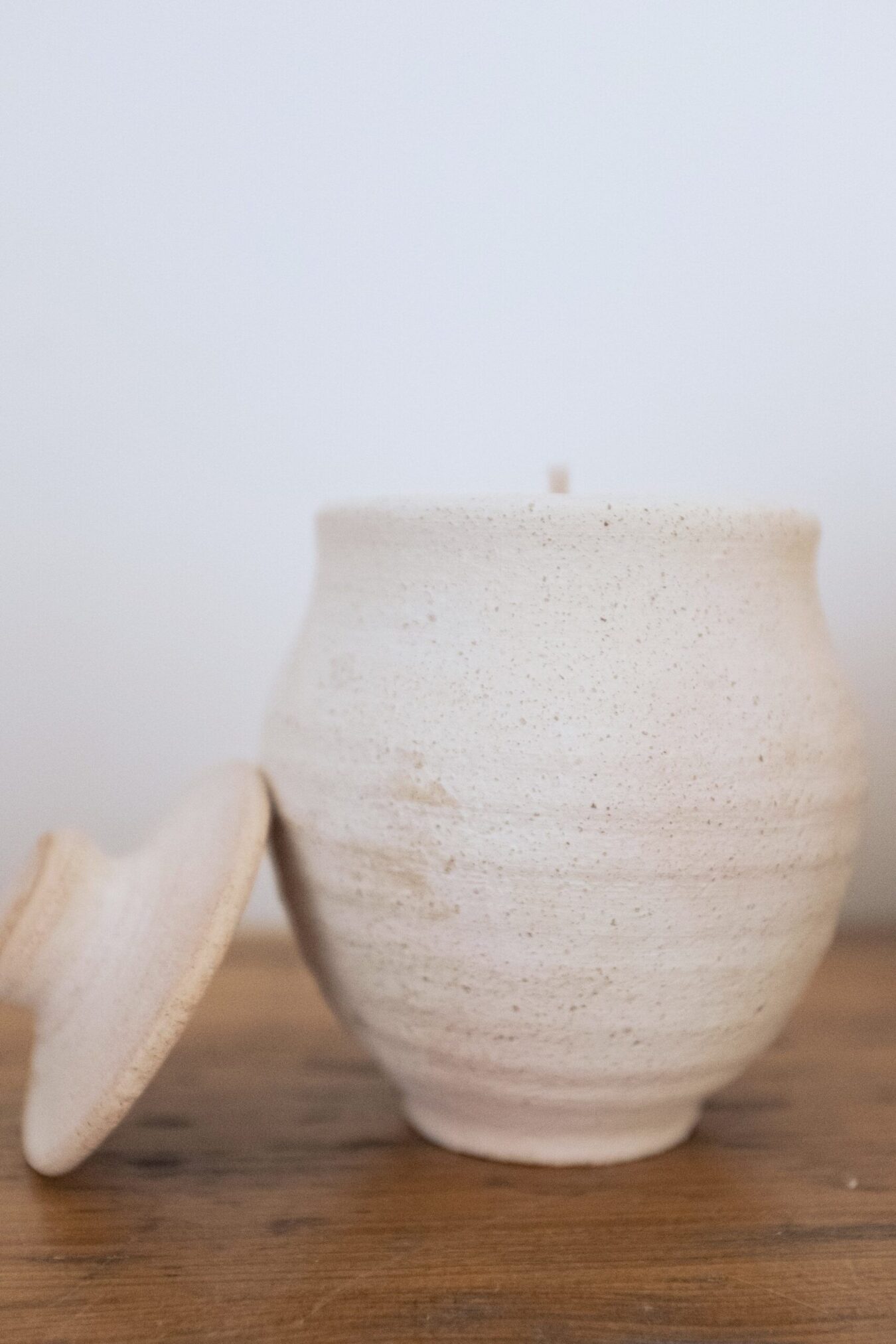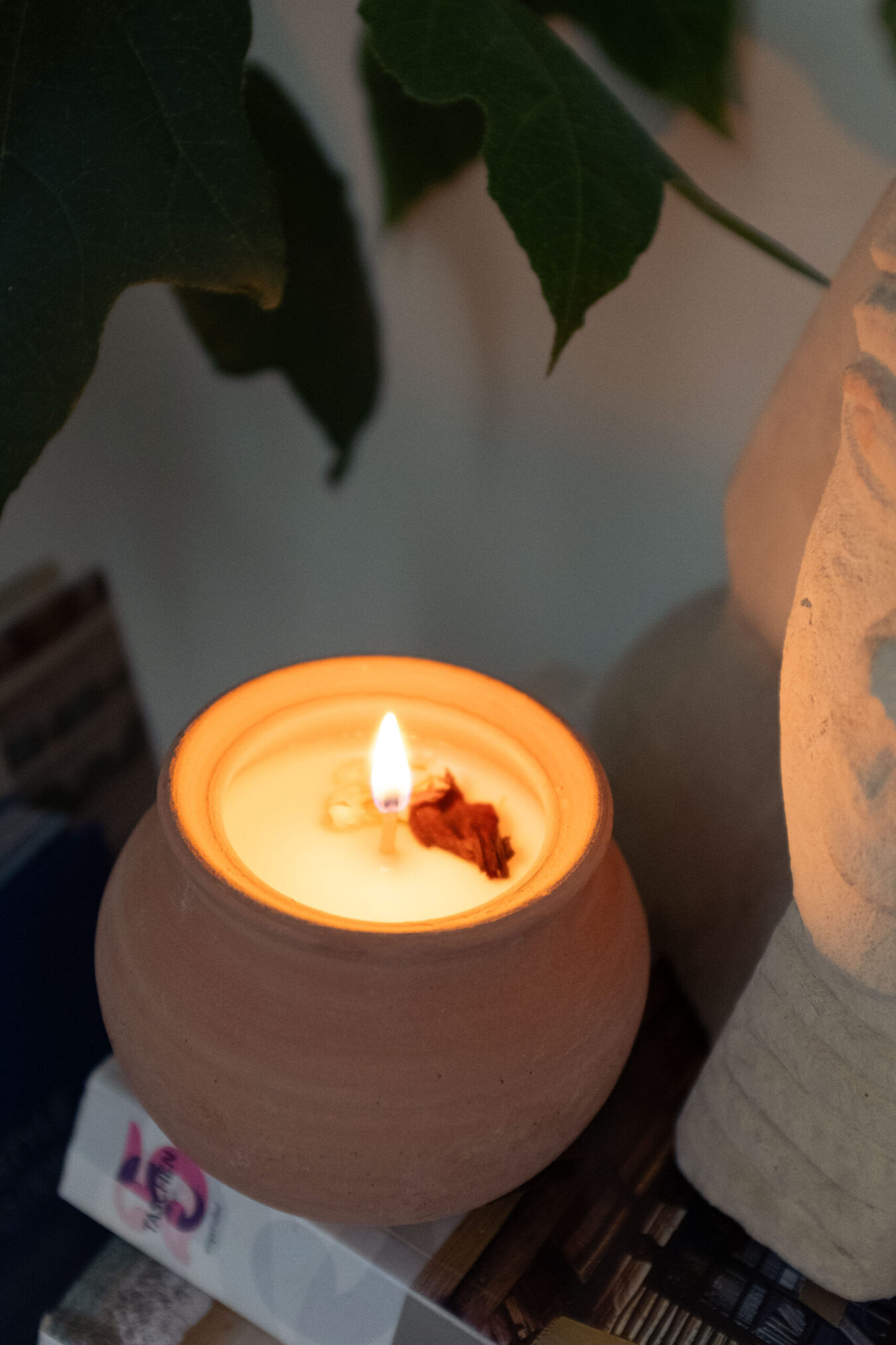 A handmade clay soy candle inspired by the warm, earthy tones of desert landscapes. Blends natural texture with refined aroma - filled with a luxurious mix of fine fragrance oils. Topped with dried flowers, this piece is as much a decorative object as it is a sensory experience. Perfect for those who appreciate craftsmanship, natural materials, and timeless desert charm. Once the candle has burned down, the vessel lives on - perfect for storing pens, dried flowers, incense sticks, or simply as a sculptural accent.